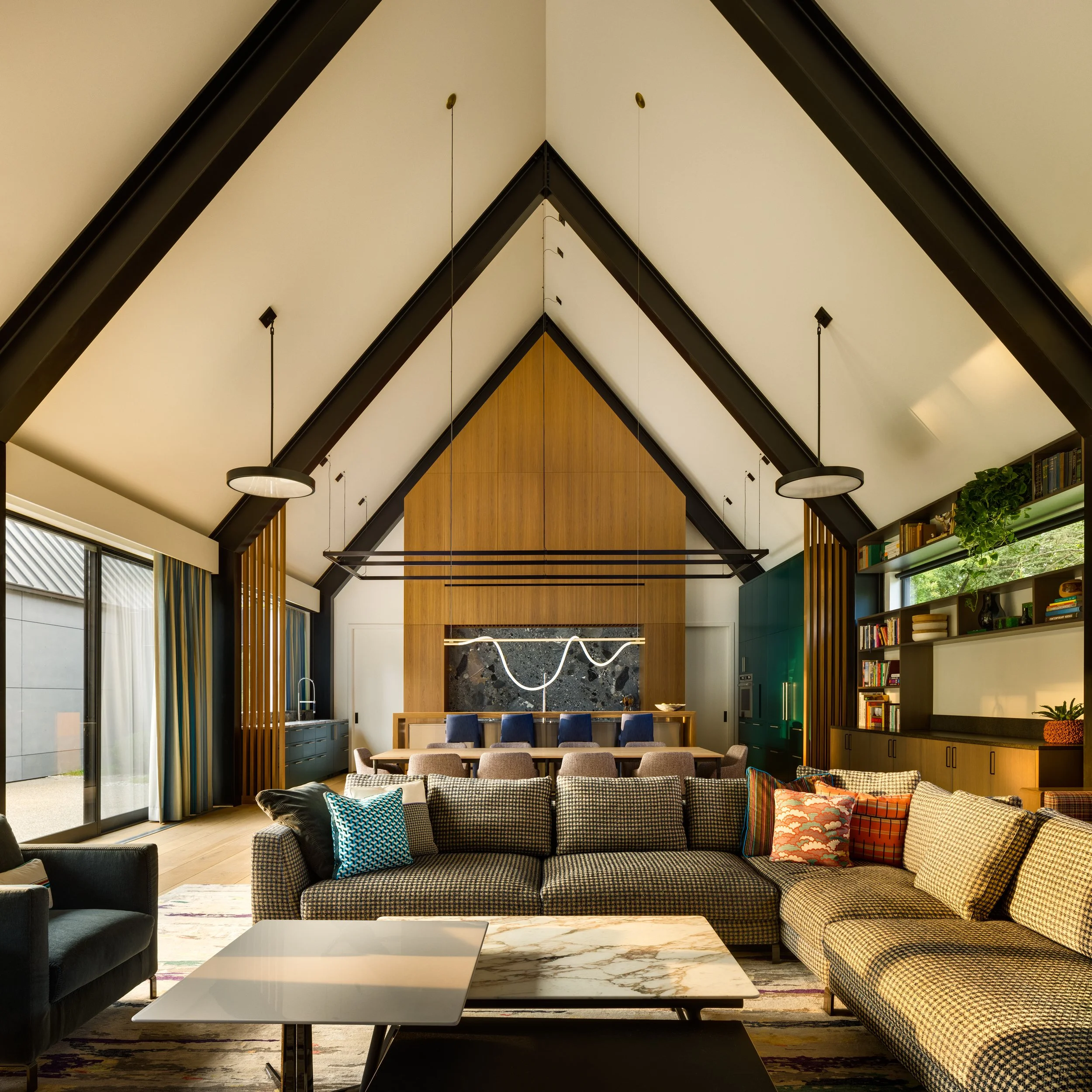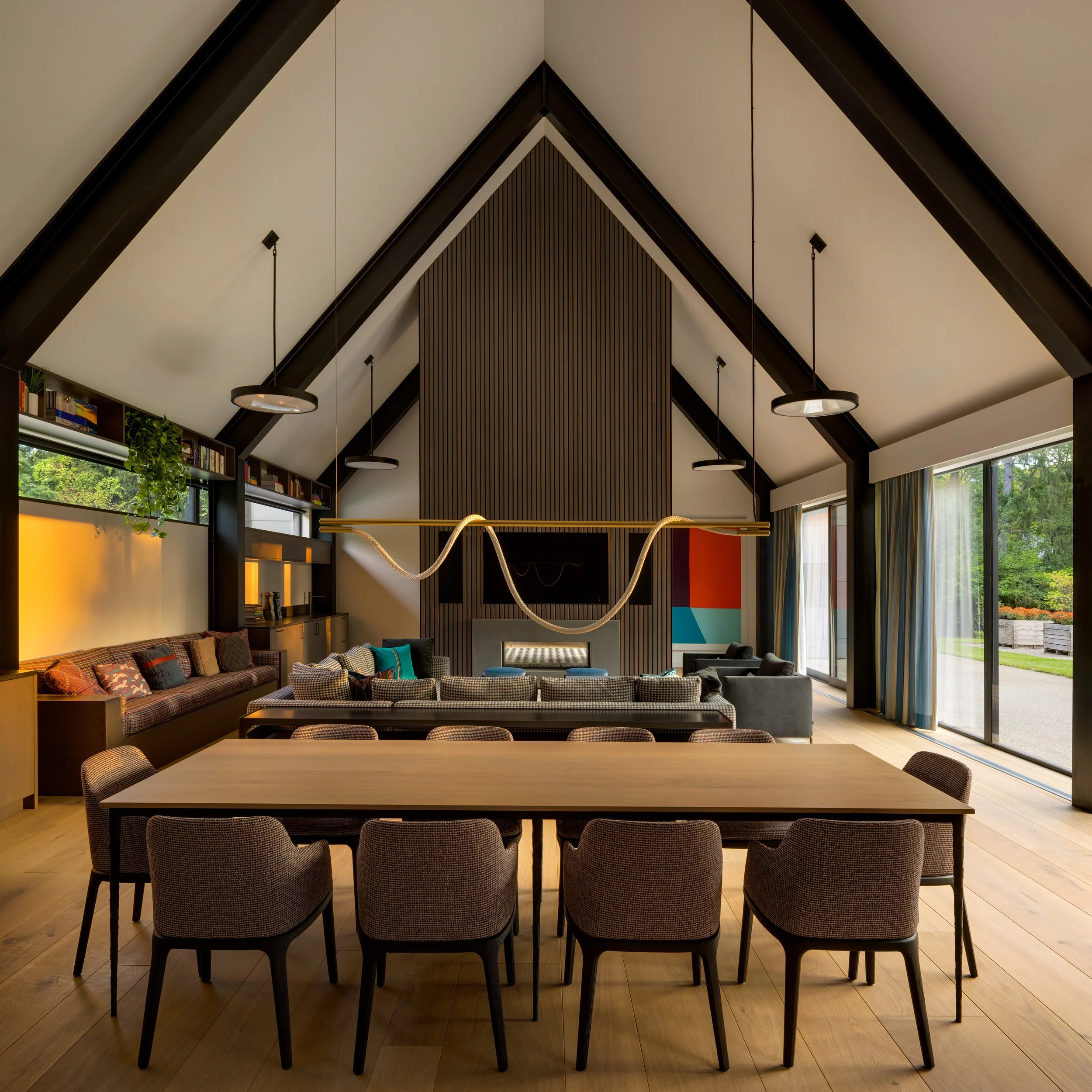 Briarcliff is set on a park-like 3.5 acres in historic Franklin, Michigan. A house in two acts, it balances an elegant form and façade with a dramatic, playful interior—fitting for a private, close-knit family passionate about music and theater.