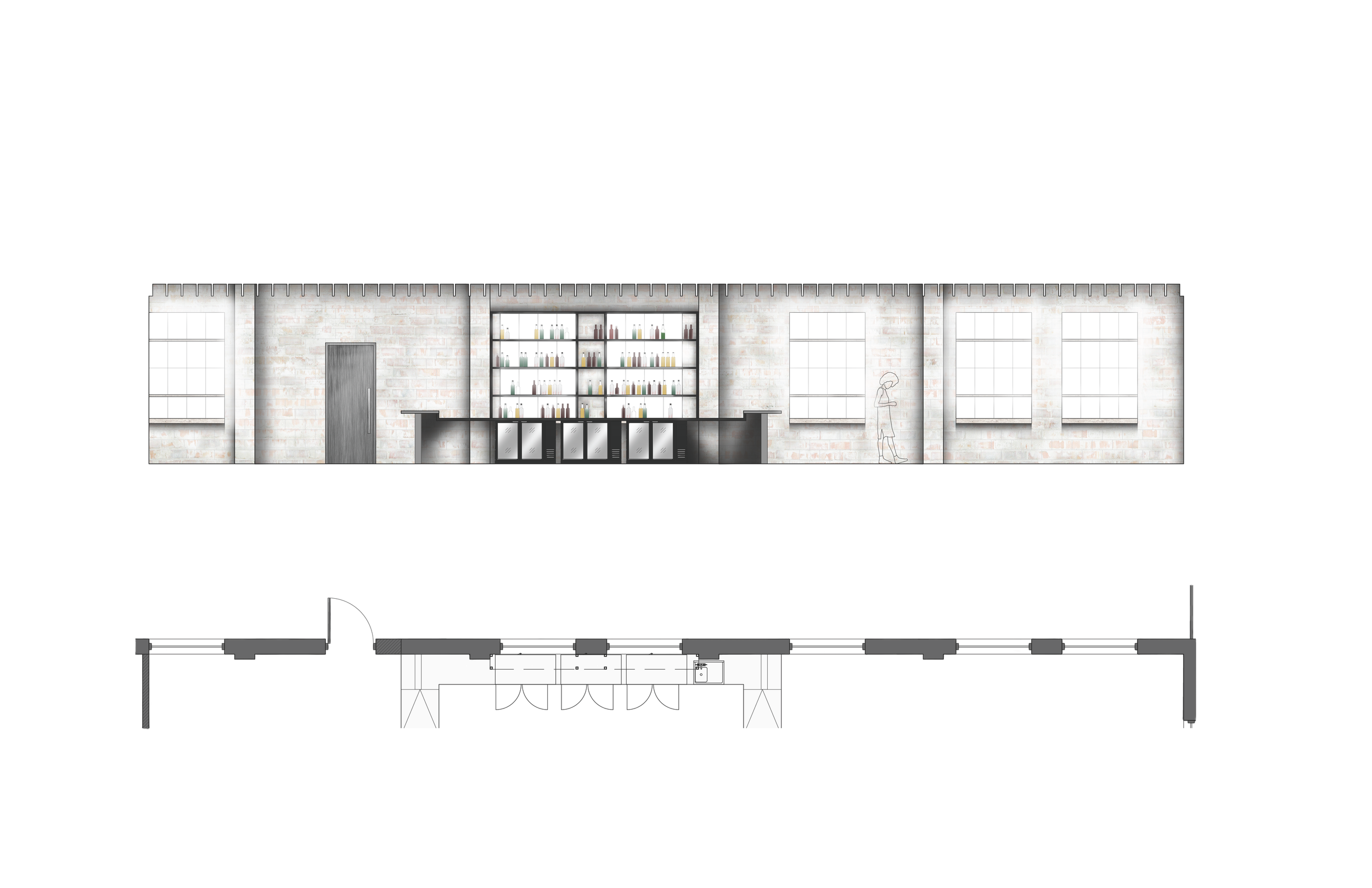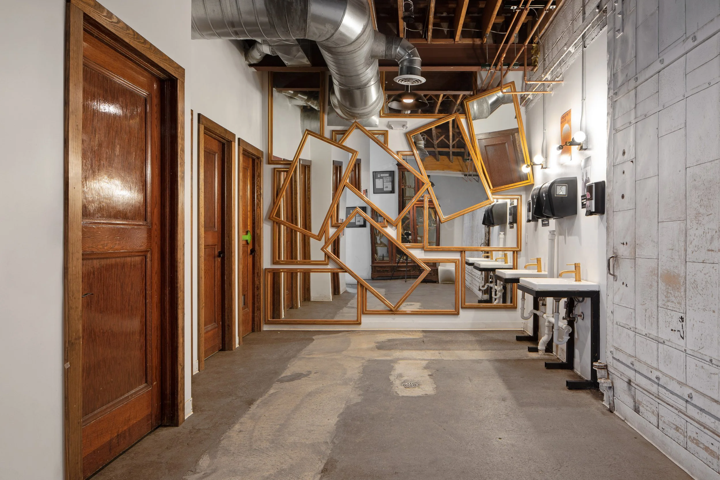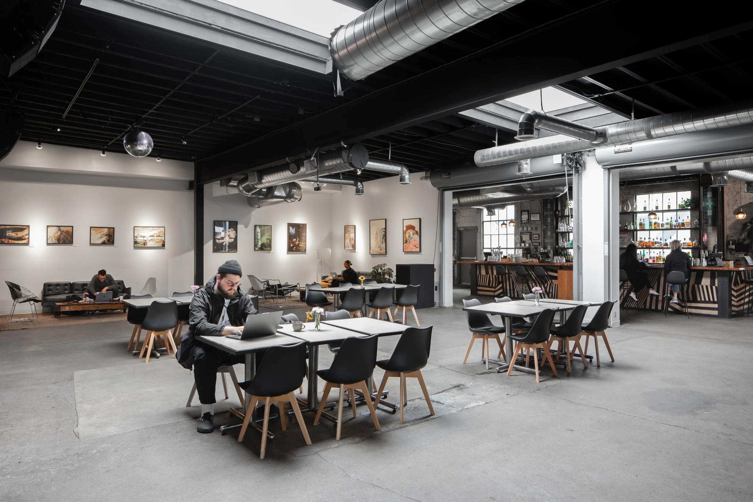 The experience of the space is amplified by the diversity of voices that contributed to its creation, much like the multi-disciplinary and industry activities happening throughout the day. In a creative solution to an occupancy restriction, three monumental overhead doors act as an organizing threshold between the bar space and the gallery space and will close automatically in the event of a fire. As a welcoming, open-minded, and safe space, one of the major challenges was securing approval for gender-neutral bathroom layouts. The project also features two massive skylights that flood the space with natural light and an activated alley with a variety of outdoor seating and site-specific artwork by local artists.