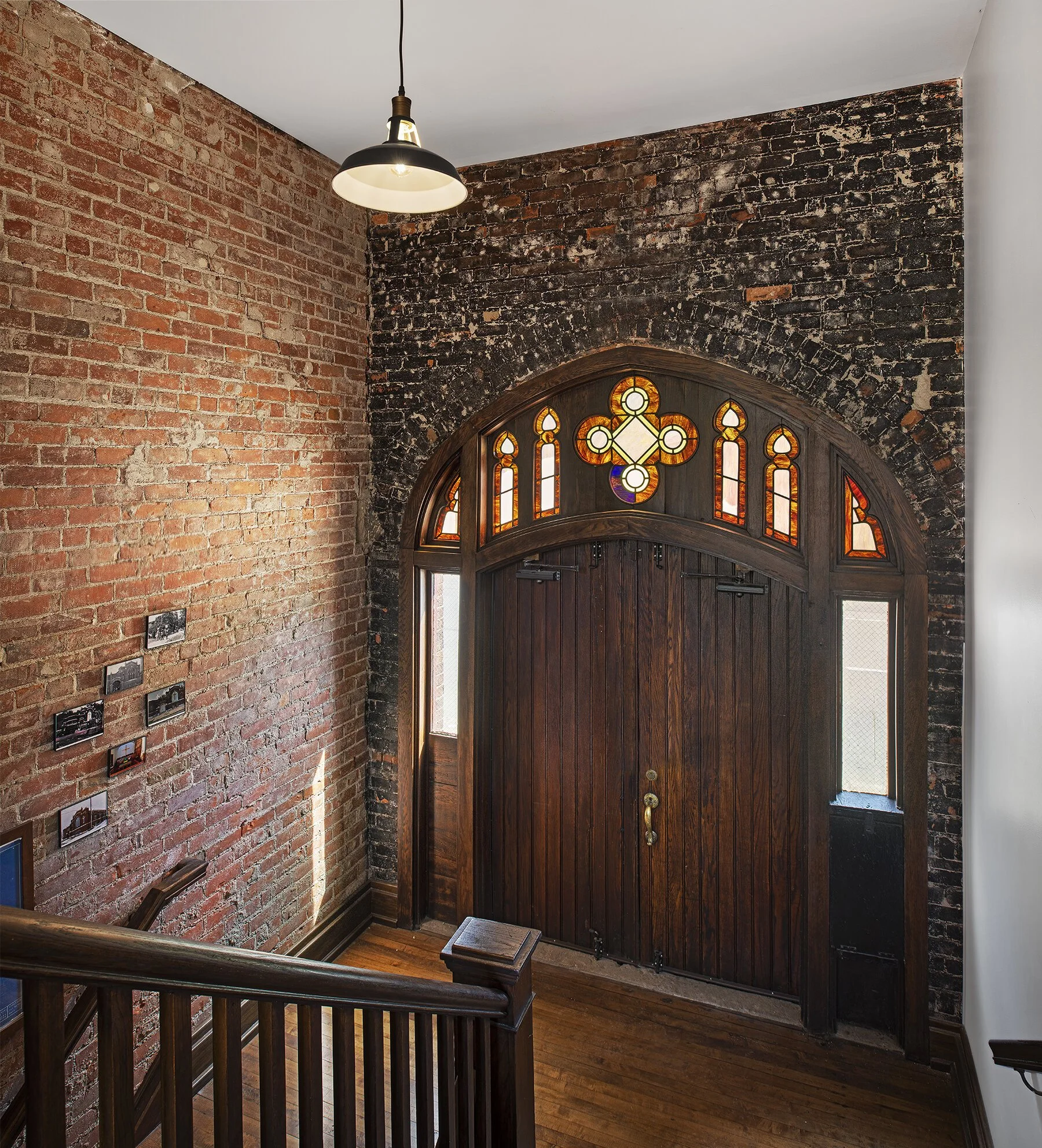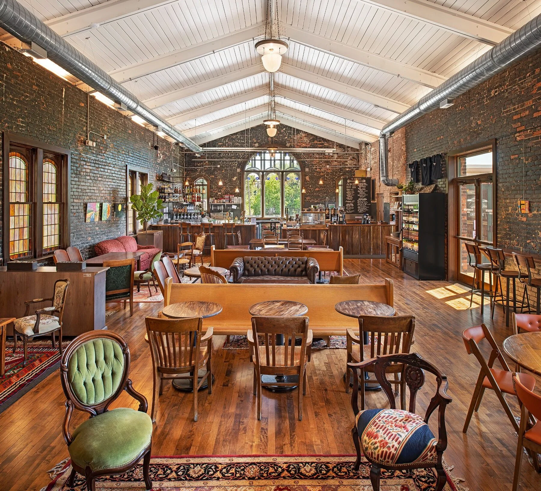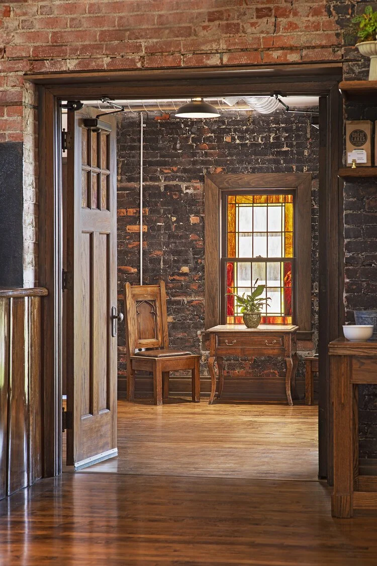 The design strives to salvage the original details and celebrate the intrinsic qualities of this historic building while creating a nurturing environment for new interactions. The missing, stained glass “rose window” was recreated in stainless steel from photos and original blueprints, and the service counter was placed on its centerline to make it the primary focus of the interior. At the opposite end of the space, the original Casavant Frere pipe organ serves as the backdrop for performances by local musicians and artists. The bar and service counter were custom fabricated from the original wood pews, creating scalloped undulations whose organic patterns play against the exposed brick walls. An eclectic mix of furniture creates a variety of seating pockets, offering countless vantage points to view the interior.