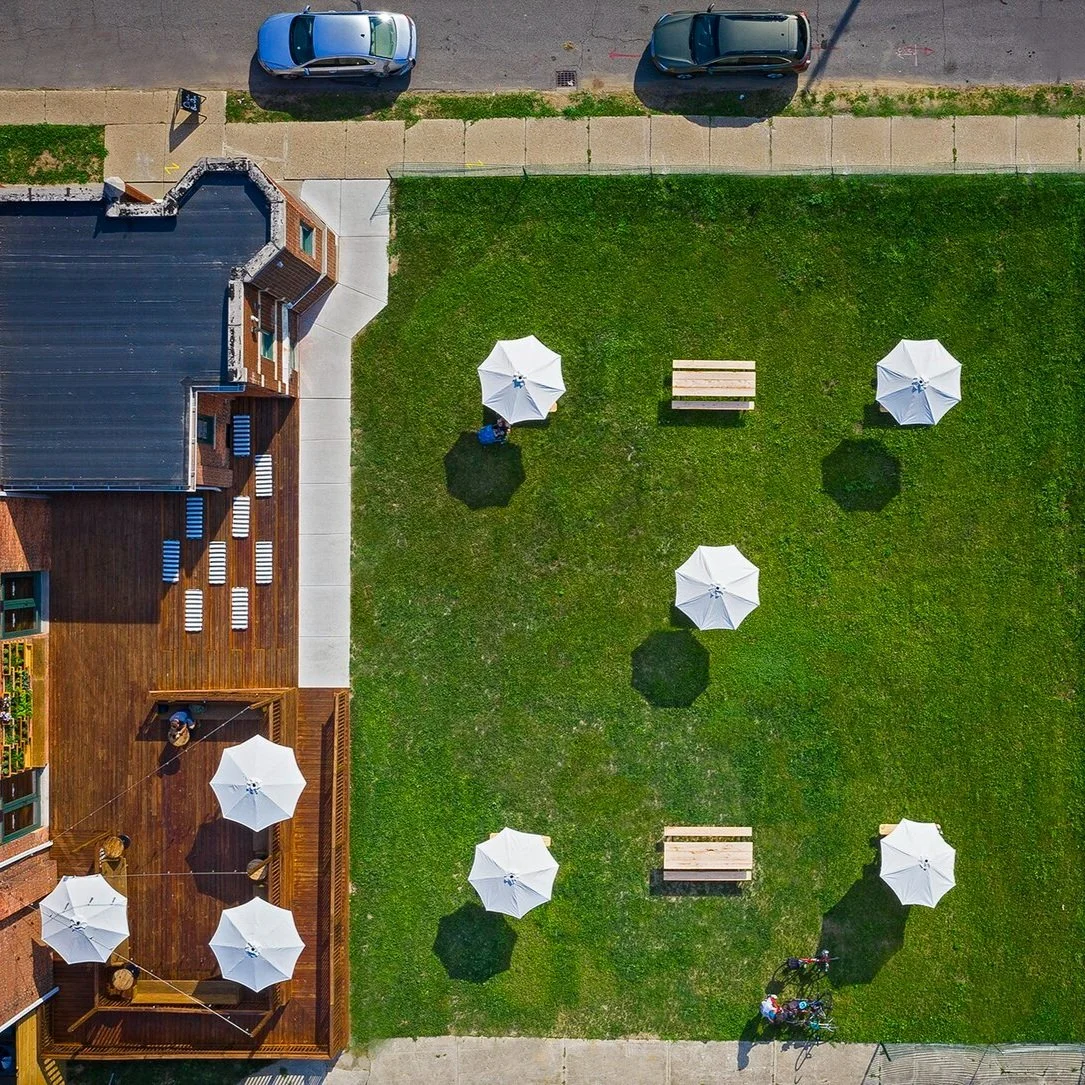 A new exterior patio created off the south façade is accessed via French doors inserted into the original window openings. Basked in southern sun exposure, the deck features stepped bleacher seating facing an expansive lawn used by the community for yoga and picnic tables alike. The patio also has a platform with banquette-style seating and a sculptural ramp that winds around the perimeter.